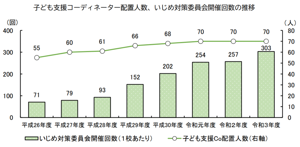 子ども支援コーディネーターの配置人数は平成26年度以降徐々に増員し、比例して学校現場におけるいじめ対策委員会の開催回数も年々増加しているとの報告があります。