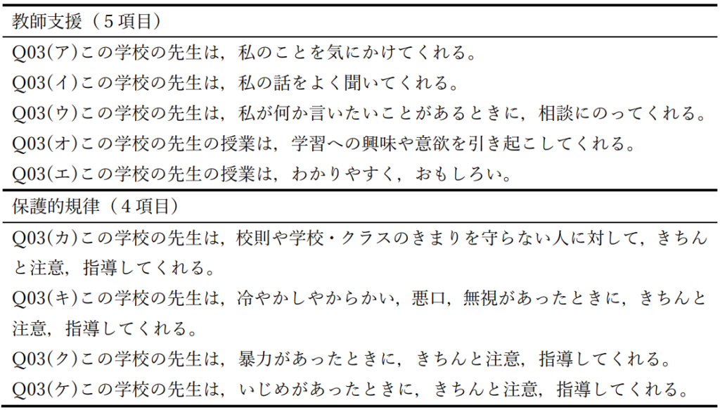 これらの項目の内容を参考に、生徒が教師の支援や保護的規律について良好な認識が持てるよう、学校全体で取り組んでいく必要があります。