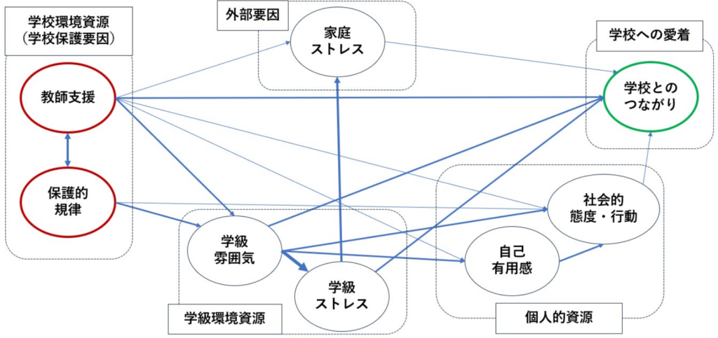 これら2つは⽣徒が教員側をどのように認識しているかを評価しており、教員の努⼒と意識によって変わり得る学校保護要因と述べられています。そして、これらが「学校とのつながり」に影響を与えることが調査により判明しました。