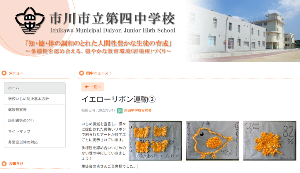 市川市の第四中学校では、イエローリボン運動として、いじめ撲滅のための掲示活動が行われています。
